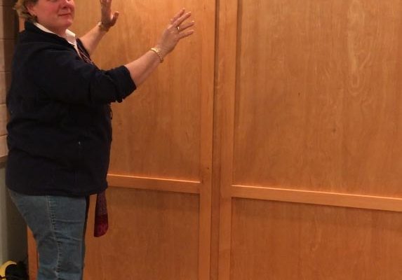 Lifting and storing Murphy bed frame into wall enclosure.